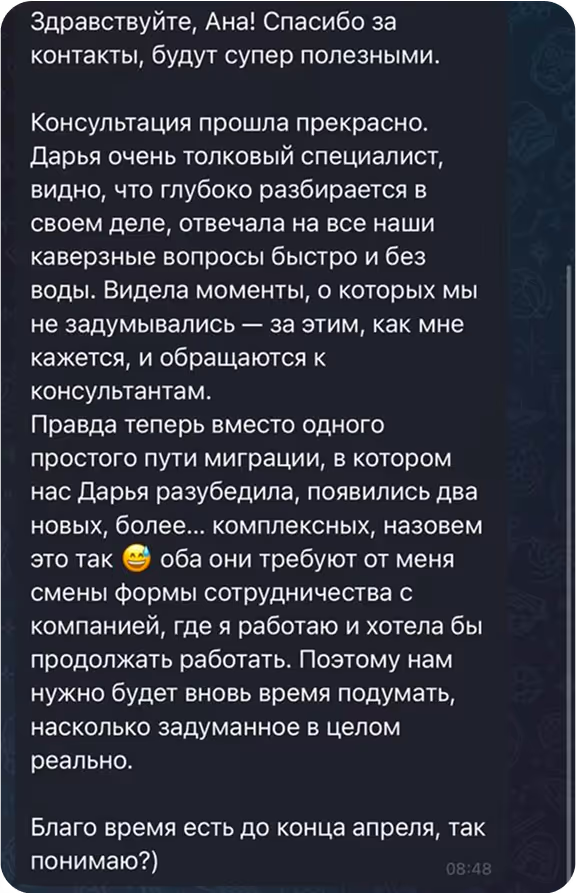 После встречи наш менеджер свяжется с вами исходя из рекомендаций эксперта и подберет оптимальный маршрут и тариф — без переплат и с учётом реальных шансов. На встрече мы не тратим время на продажную часть.